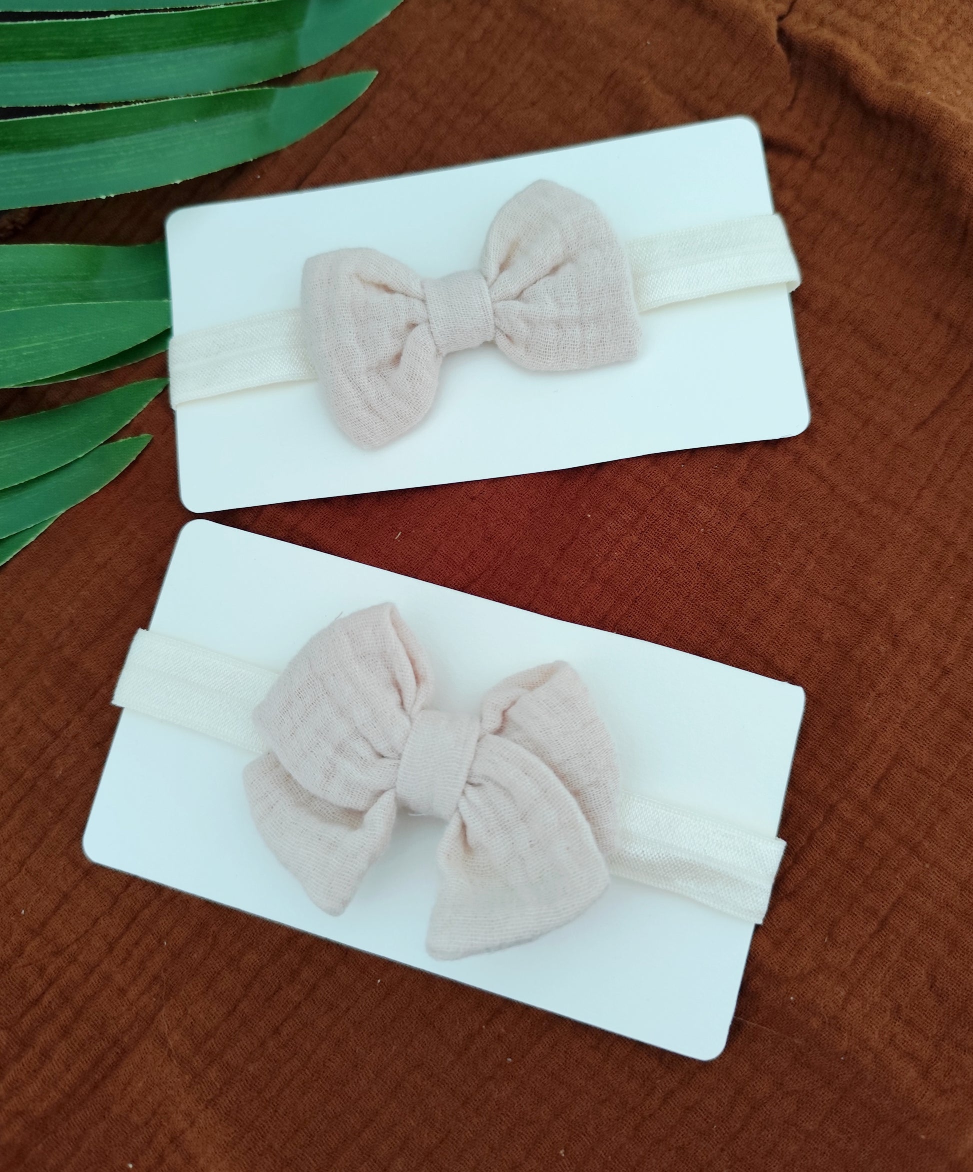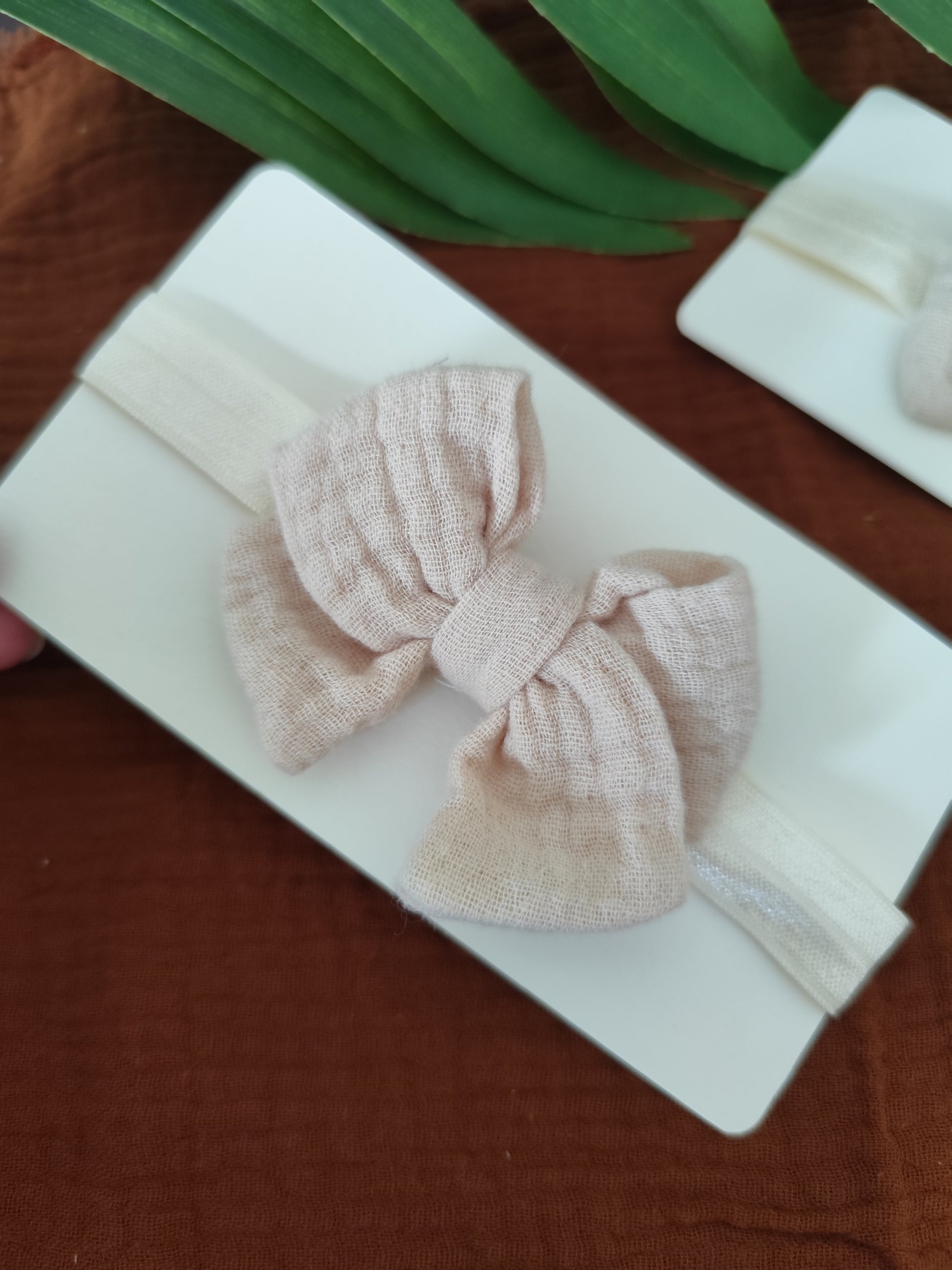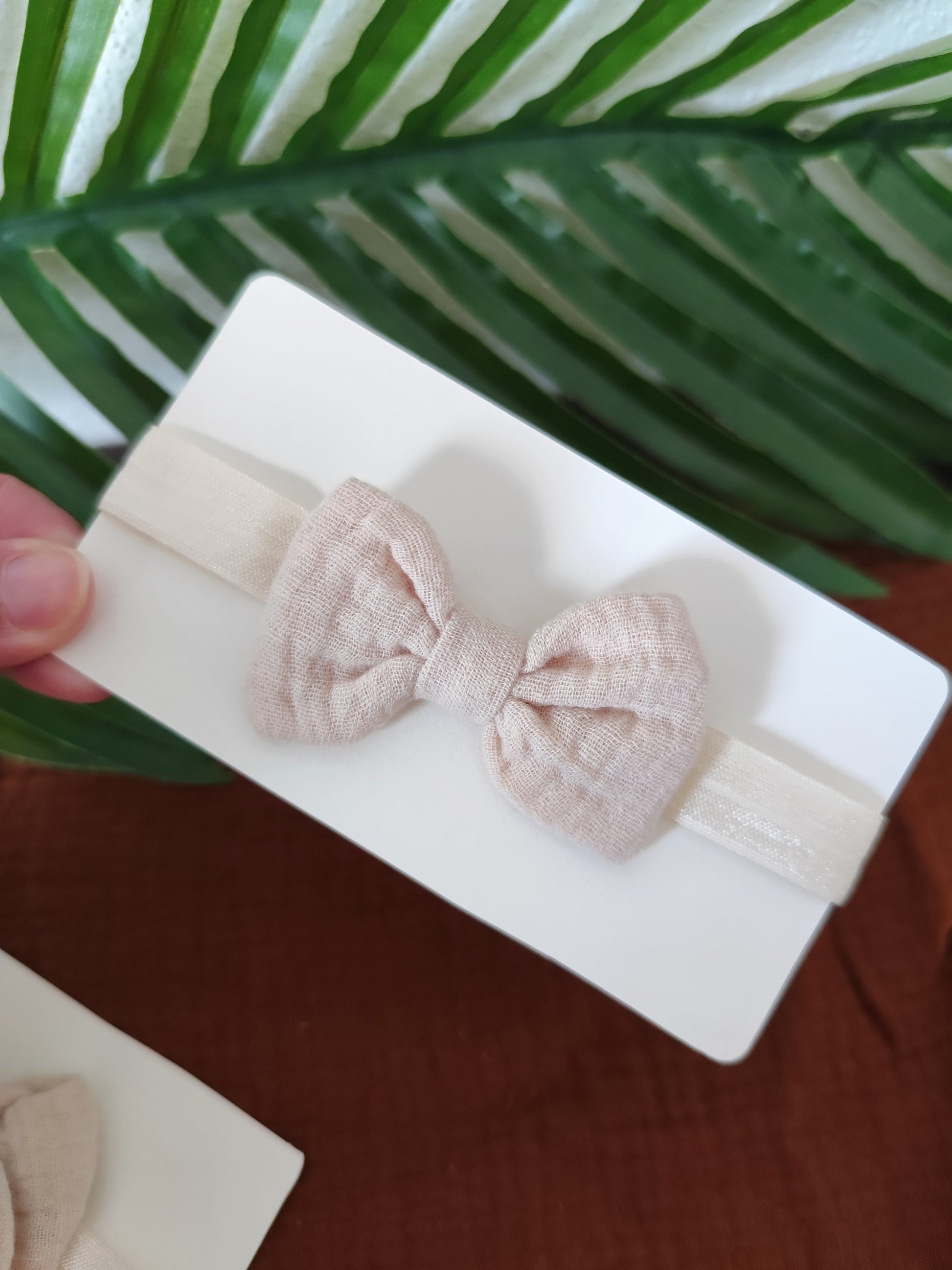 Cinta con un delicado lazo de muselina hecho a mano.