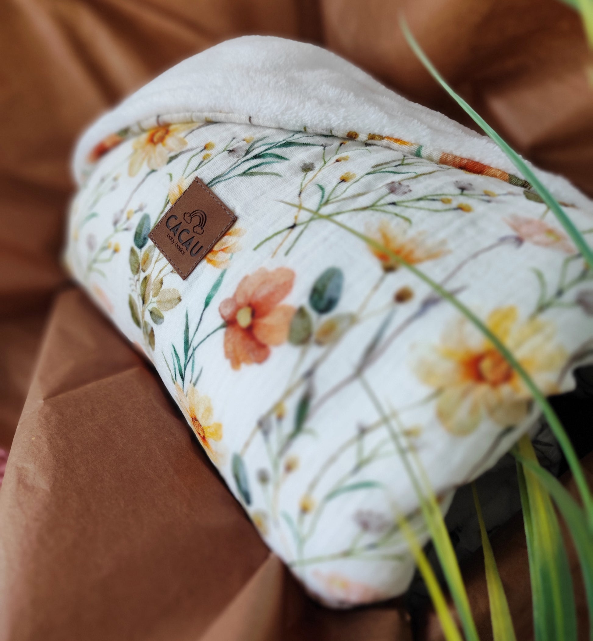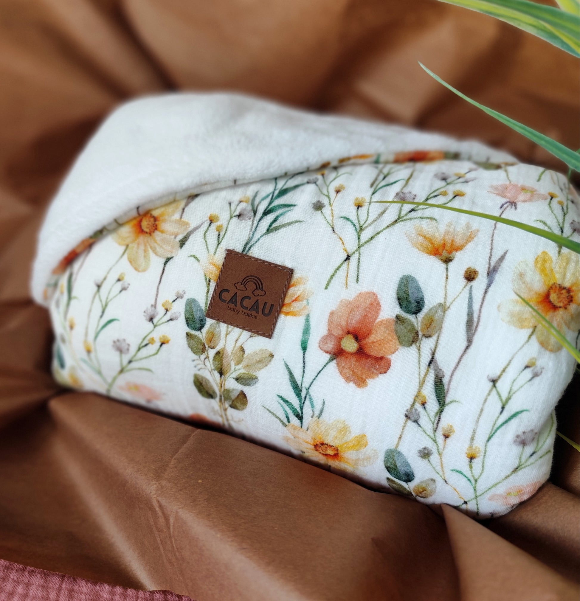 Por un lado muselina 100% algodón y por el otro la más suave piel sintética de coralina.