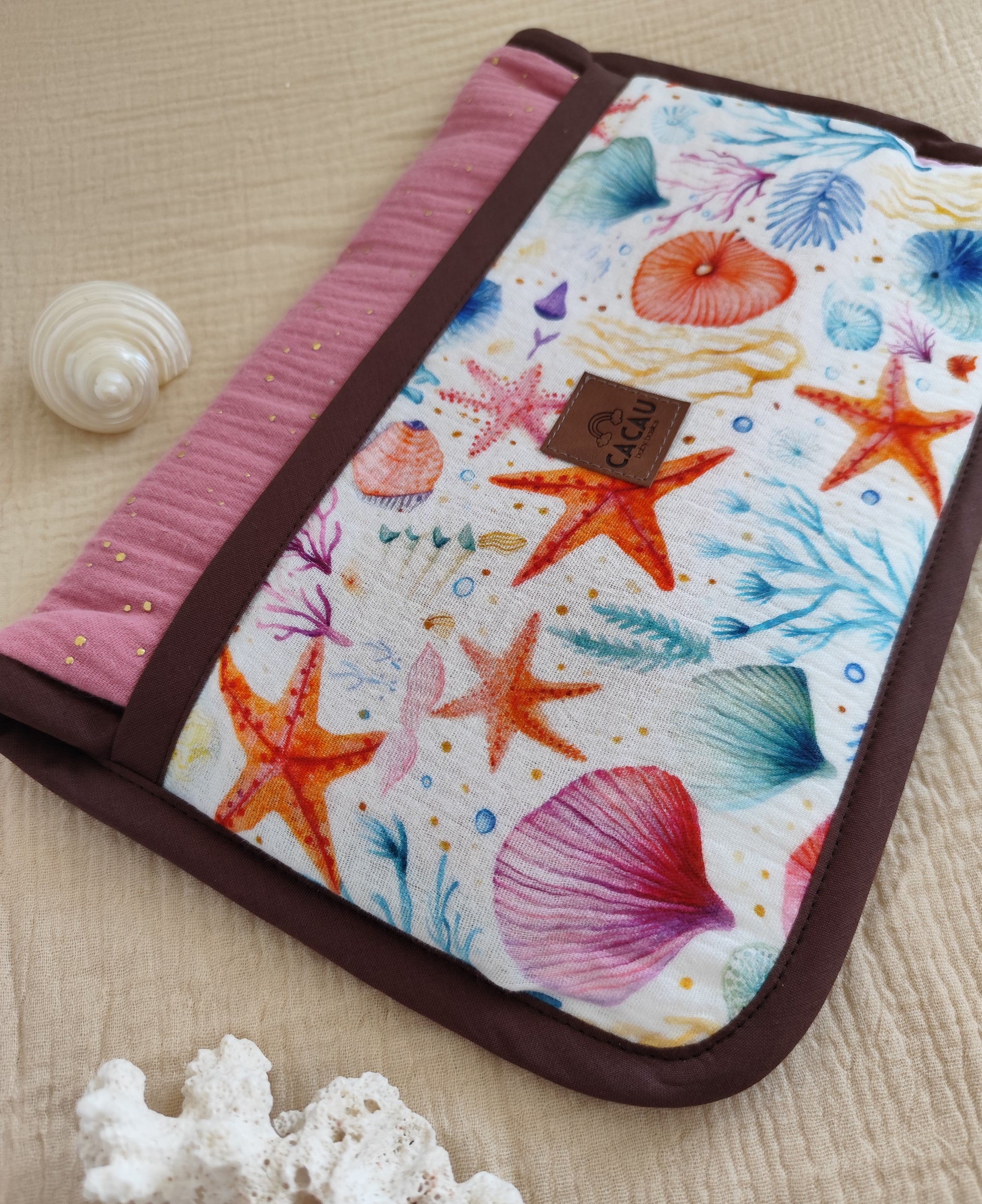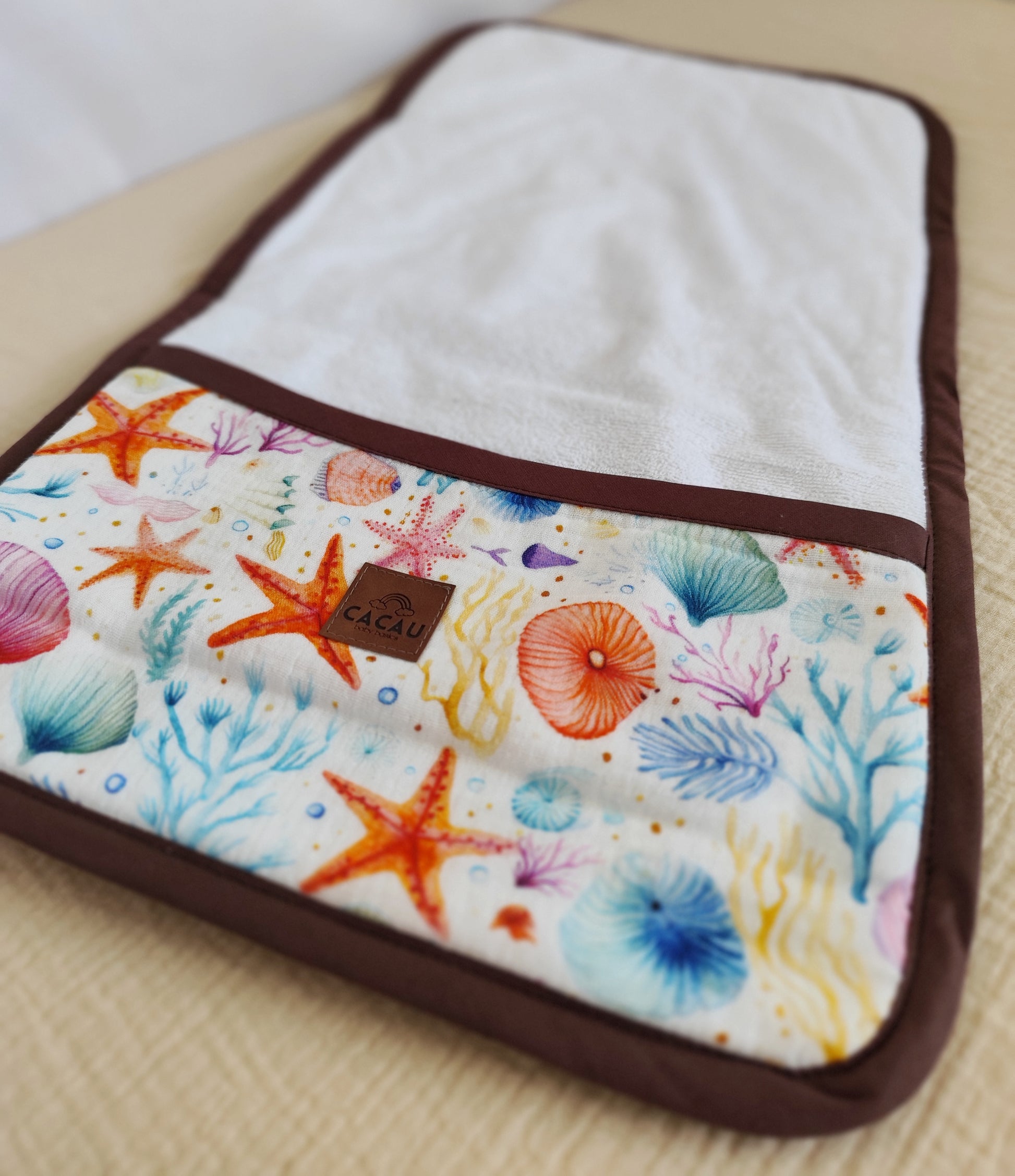 Feito à mão em Musselina e Turco, este muda fraldas portátil tem enchimento fofo para garantir conforto em qualquer superfície.