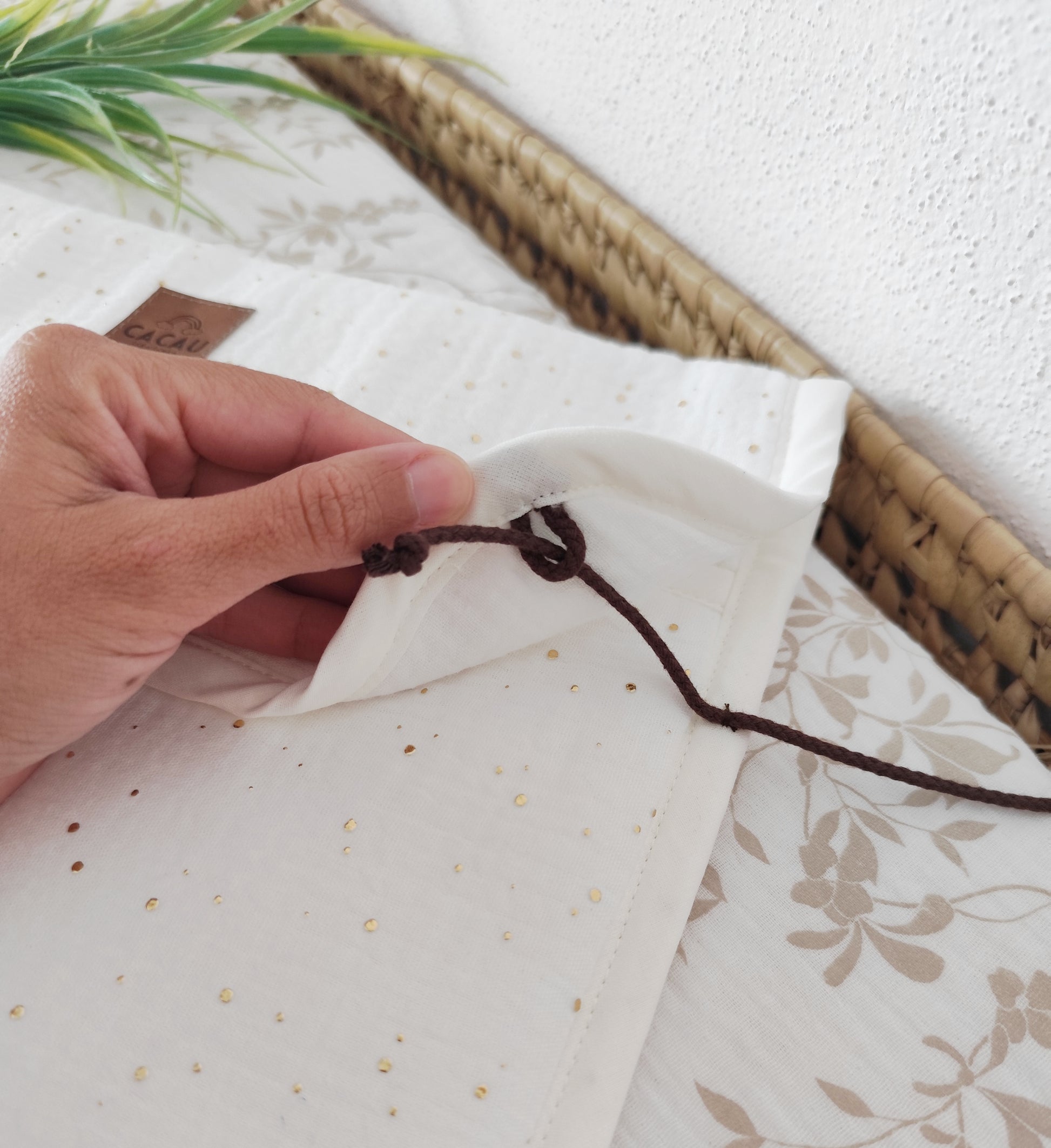 Feitas em Musselina, com enchimento fofo, fecha na lateral com cordão de cor chocolate.