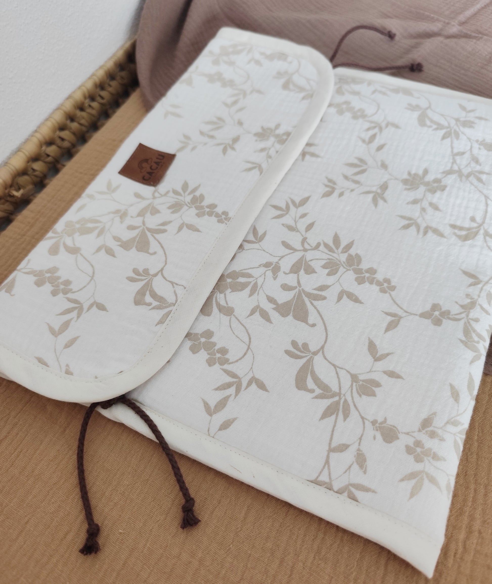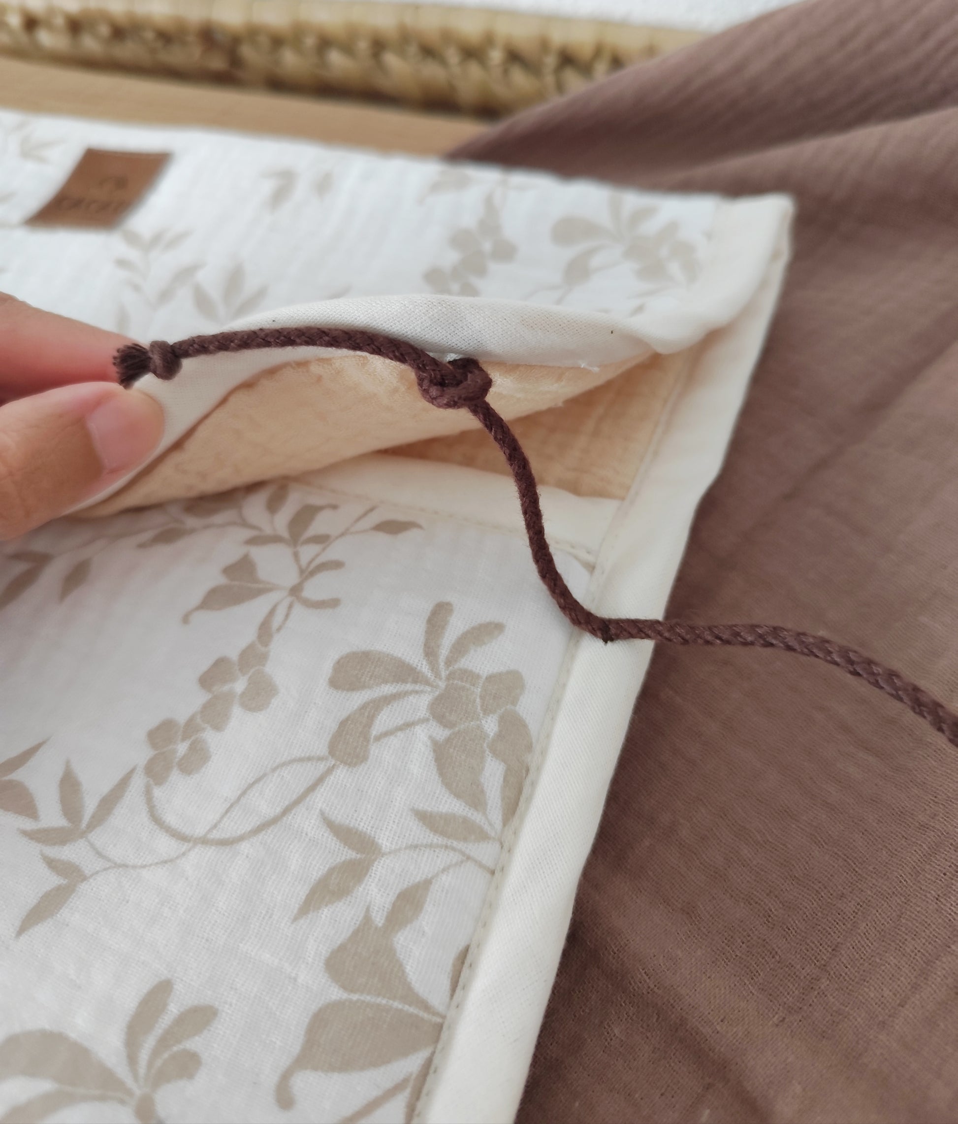 Feitas em Musselina, com enchimento fofo, fecha na lateral com cordão de cor chocolate.