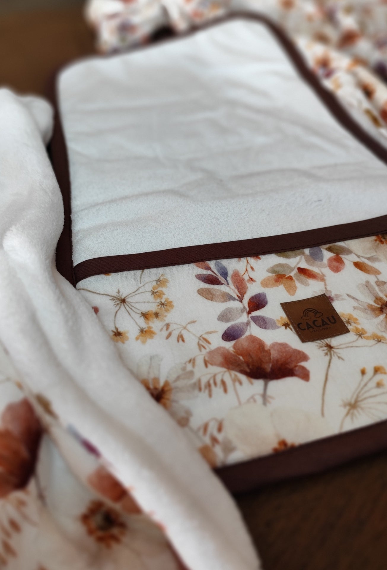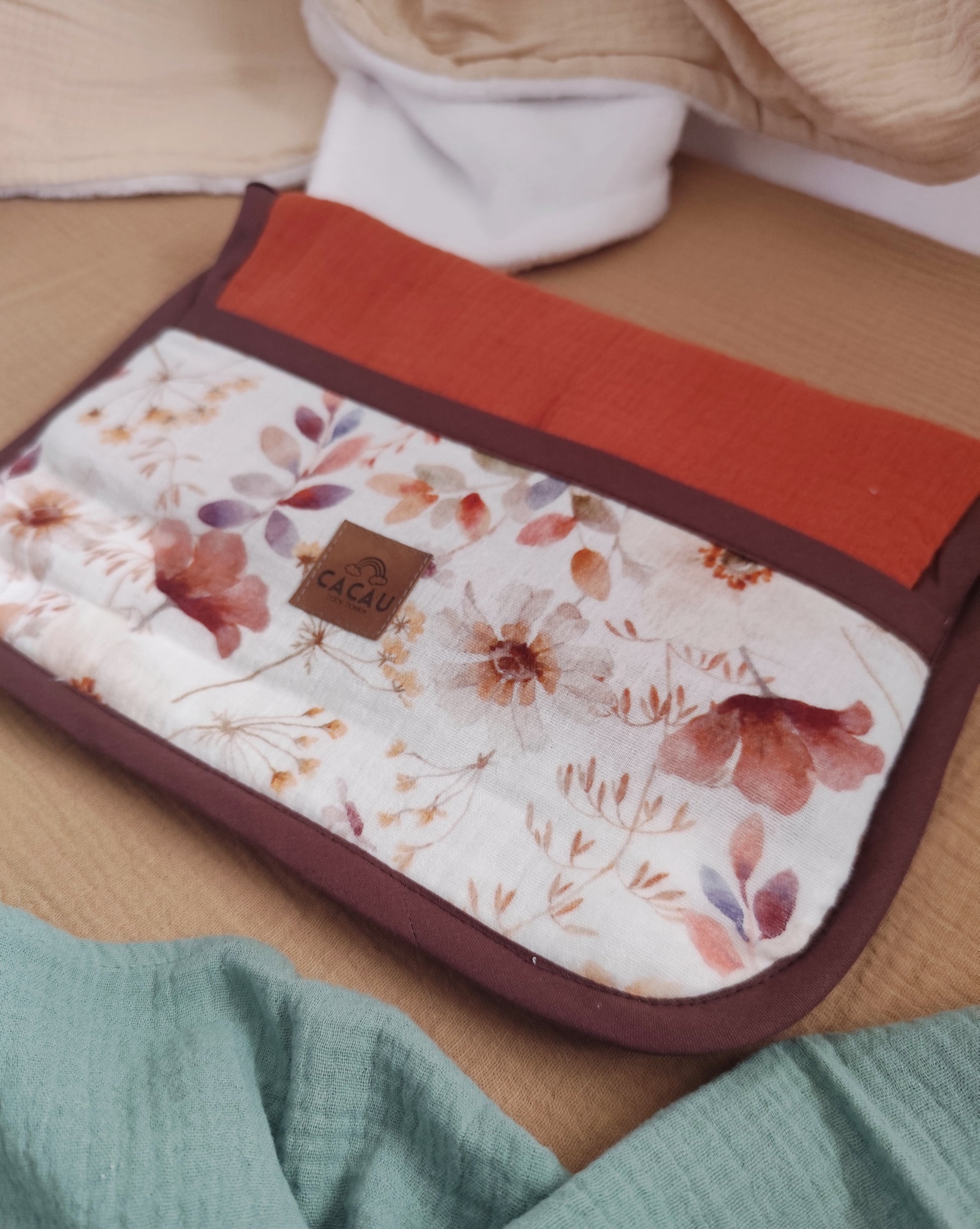 Feito à mão em Musselina e Turco, este muda fraldas portátil tem enchimento fofo para garantir conforto em qualquer superfície.