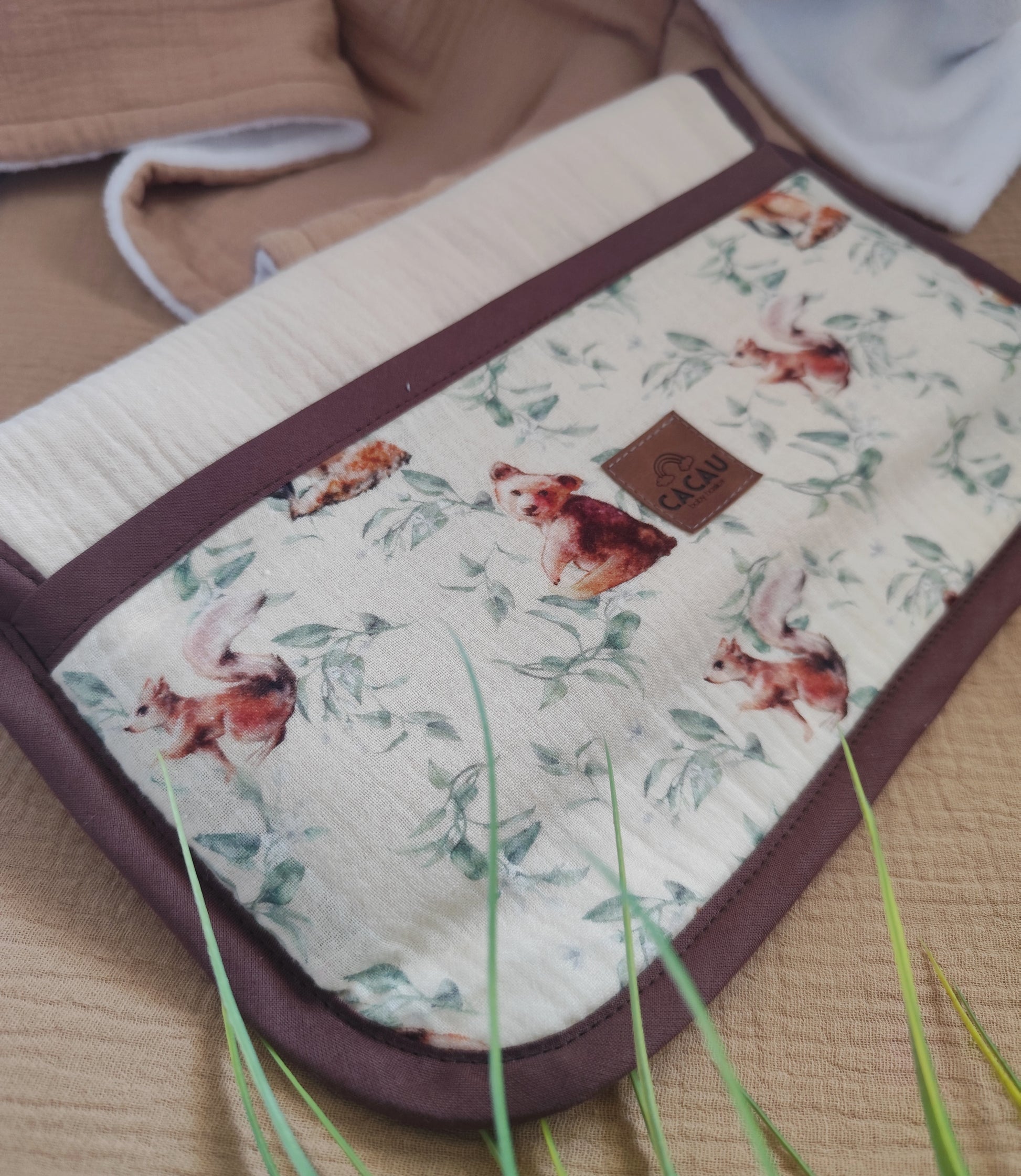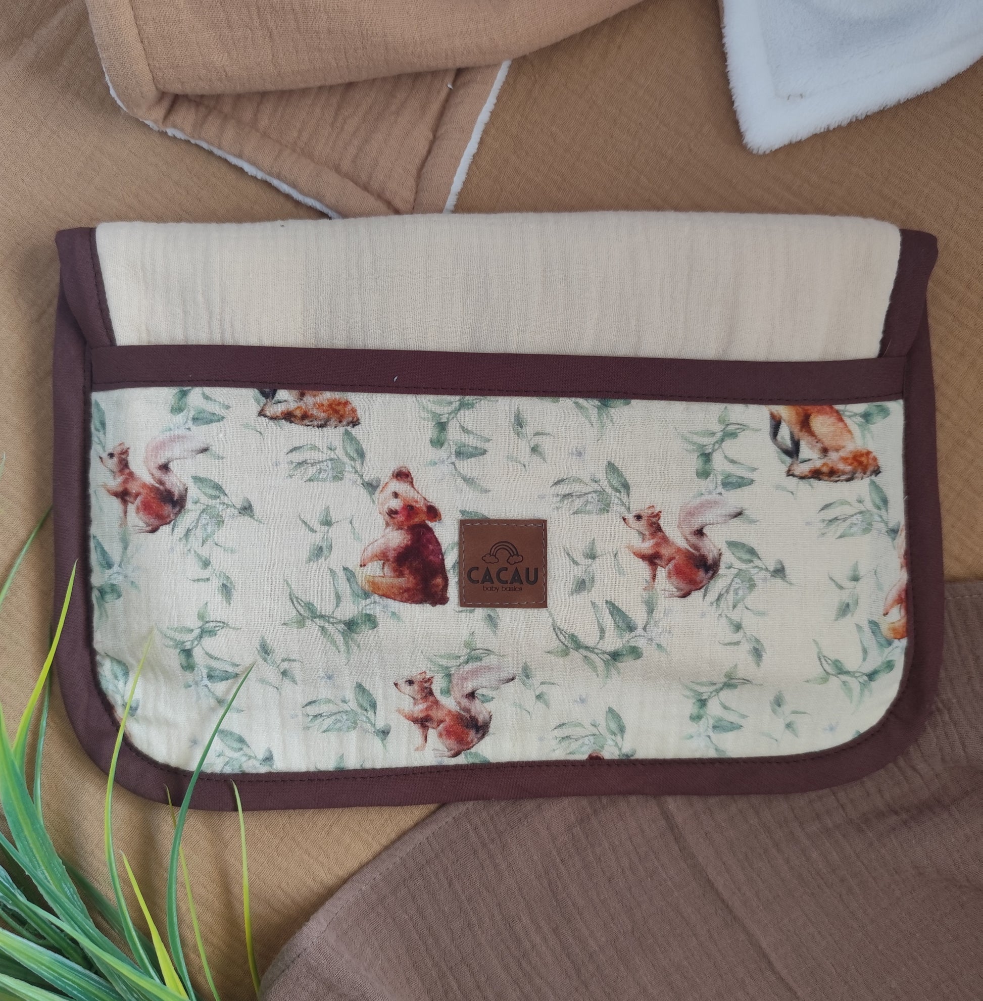 Feito à mão em Musselina e Turco, este muda fraldas portátil tem enchimento fofo para garantir conforto em qualquer superfície.